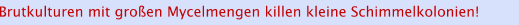 Schnell wird man festellen, dass das Pilzmycel weiter ausflaumt und um den Schimmel eigenartige 'Höfe' bildet, ihn dann langsam einnimmt, dabei vollständig besiedelt. Der Schimmel wird regelrecht aufgefressen. Erst dachte ich, er wird nur eingeschlossen, aber es sieht definitiv nach Verstoffwechselung aus! Das Nutzpilzmycel sondert hierbei chemische Kampfstoffe aus (der Schimmel natürlich auch), die ich hier unter anderem bildlich dokumentieren will.