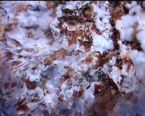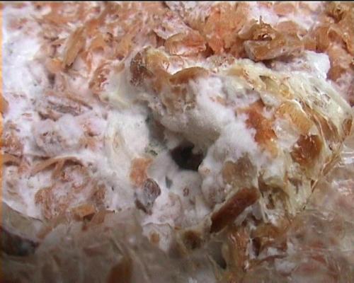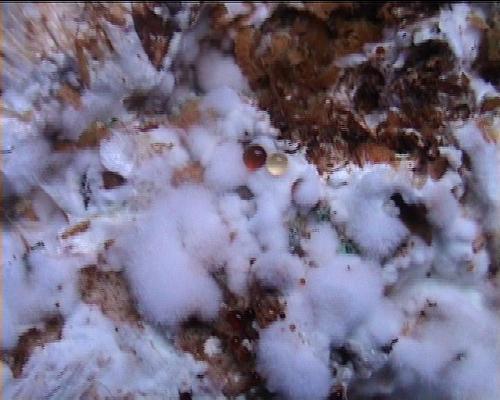 Oben sieht man diese chemischen Stoffwechselprodukte sehr gut, die beiden farblich verschiedenen 'Tropfen'. Rechts direkt darunter schimmert noch Grünes durch. Das Weisse ist in dem Fall Shiitake Mycel. Denn sogar der Schiitake kriegt den Schimmel klein!!!
