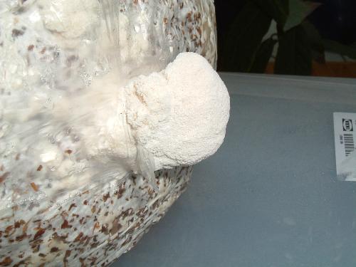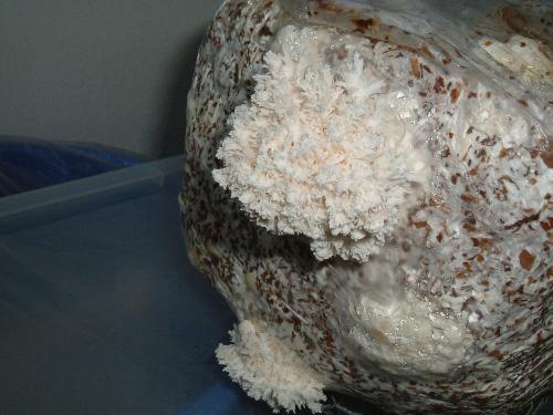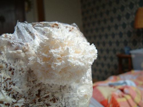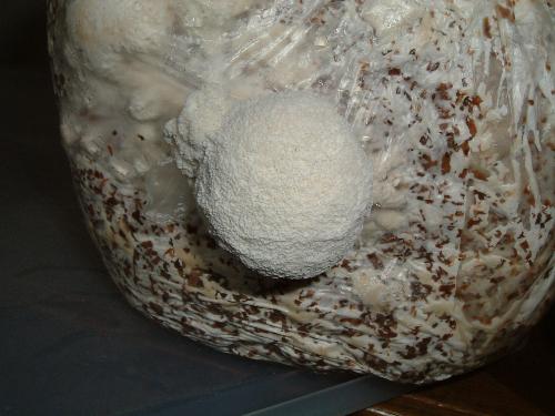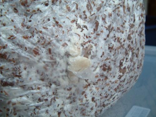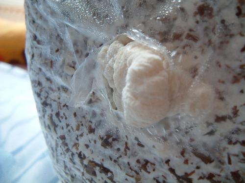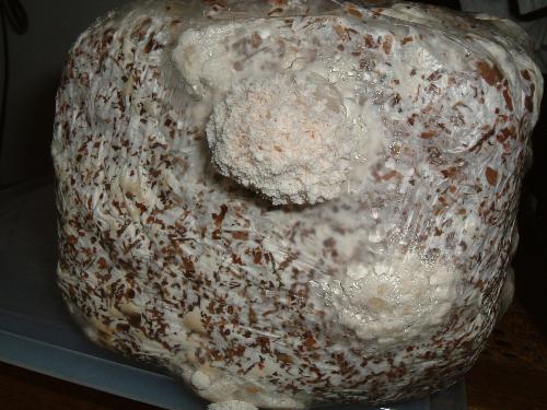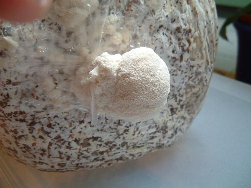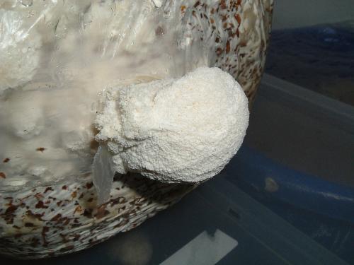 Wie ich ja schon bei der Brut geschrieben habe, kann es leider trotz gutem Abtropfen der Holzbrut und vorsichtigem sorgfältigem Inokulieren immer wieder passieren, dass sich an feuchten Stellen an der Beutelwand Schimmel ansiedelt. Natürlich ist dieses Risiko fast gleich null, wenn das Substrat sterilisiert wird. Manch einer wird die fast vollständig bewachsene Kultur vielleicht wegwerfen wollen, einfach weil jeder die gesundheitlichen Auswirkungen von Schimmel und seinen Sporen kennt.
