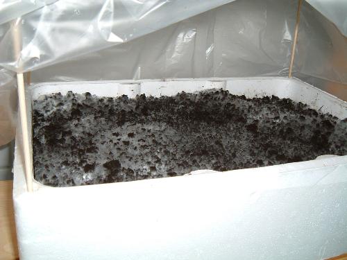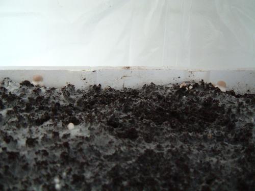 Leider wuchs auf der Deckerde nach dem Durchfeuchten (war leicht abgetrocknet nach der Ernte) ein wenig Schimmel und daher habe ich mich entschlossen, sie zu verwerfen. Dabei hab ich festgestellt, dass der wichtigste Grund für das unregelmässige, schlechte Fruchten und schwächeln des Mycels tatsächlich das Strohsubstrat war. Die Dungpartien waren eindeutig fester und dichter bewachsen und mit Rizomorphen durchsetzt, während das Stroh weitgehend fest blieb und wenig verstoffwechselt wurde. Werde also daher bei weiteren Versuchen das Stroh häckseln und auf maximal ein Drittel reduzieren. Besser wäre natürlich Pferdedungkompost, aber der Pferdedung wurde auch ganz gut vom Pilz angenommen.
