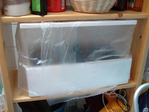 Hier sieht man die 15L Kiste mit Feuchtezelt. Da mein Badezimmer doch recht trockene Luft hat, habe ich ne Tüte drummgespannt. Einfach auf den Deckel geklebt und diesen mit Pflanzenstäben über die Kiste gelegt. Temperatur übrigens 15-17Grad.